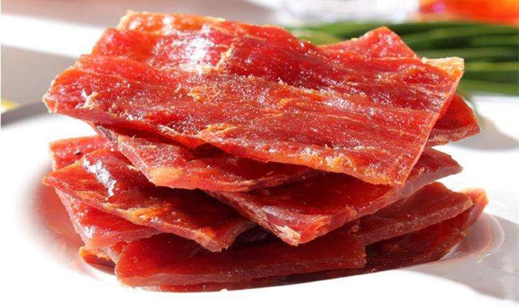 豬肉烘干:烘干的目的主要是促進發色和脫水熟化。將鋪平在篩子上的已連成一大張的肉片放入烘干房中,烘干的溫度在55~60℃,前期烘干溫度可稍高。